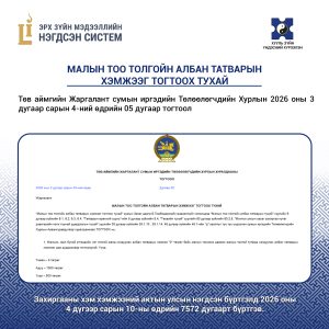 МАЛЫН ТОО ТОЛГОЙН АЛБАН ТАТВАРЫН ХЭМЖЭЭГ ТОГТООХ ТУХАЙ Төв аймгийн Жаргалант сумын иргэдийн Төлөөлөгчдийн Хурлын 2026 оны 3 дугаар сарын 4-ний өдрийн 05 дугаар тогтоол 2026-04-22 Б.Бат-Эрдэнэ 12 Мэдээ
